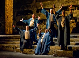 Lee Mark Nelson, Richard Ooms, Robert Robinson, Joe Nathan Thomas and T. Mychael Rambo as the Chorus in the Guthrie Theater's production of THE BURIAL AT THEBES, by Seamus Heaney, based upon Sophocles' Antigone. Directed by Marcela Lorca, composer J.D. Steele, set design by Monica Frawley, costume design by Elizabeth Caitlin Ward and lighting design by Christopher Akerlind. September 24 - November 6, 2011 on the McGuire Proscenium Stage at the Guthrie Theater, Minneapolis. Photo by Michael Brosilow