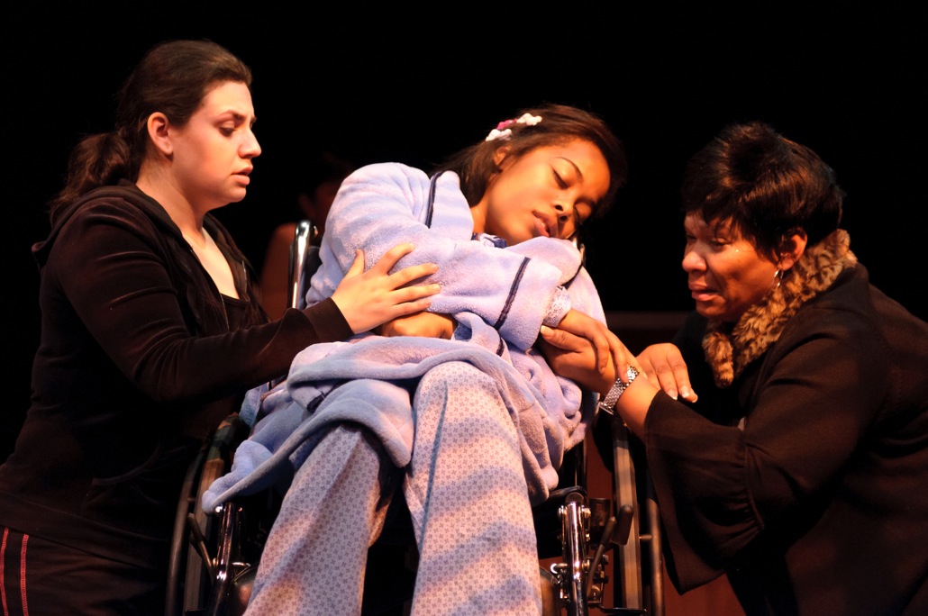 The Center of the Margins festival at the Mixed Blood Theatre has the admirable mission of producing plays involving populations that we don’t often see on stage. My Secret Language of Wishes, the second play to premiere as part of the festival, centers around a seventeen-year-old girl with cerebral palsy and the women who, to varying degrees, learn to care for her. Although the script – an all-out tearjerker by Cori Thomas – presents some significant ideological issues surrounding the portrayal of disabilities, Brittany Bradford‘s performance as Rose feels stunningly real, lending a human face to a disability that is rarely ever explored in the media.