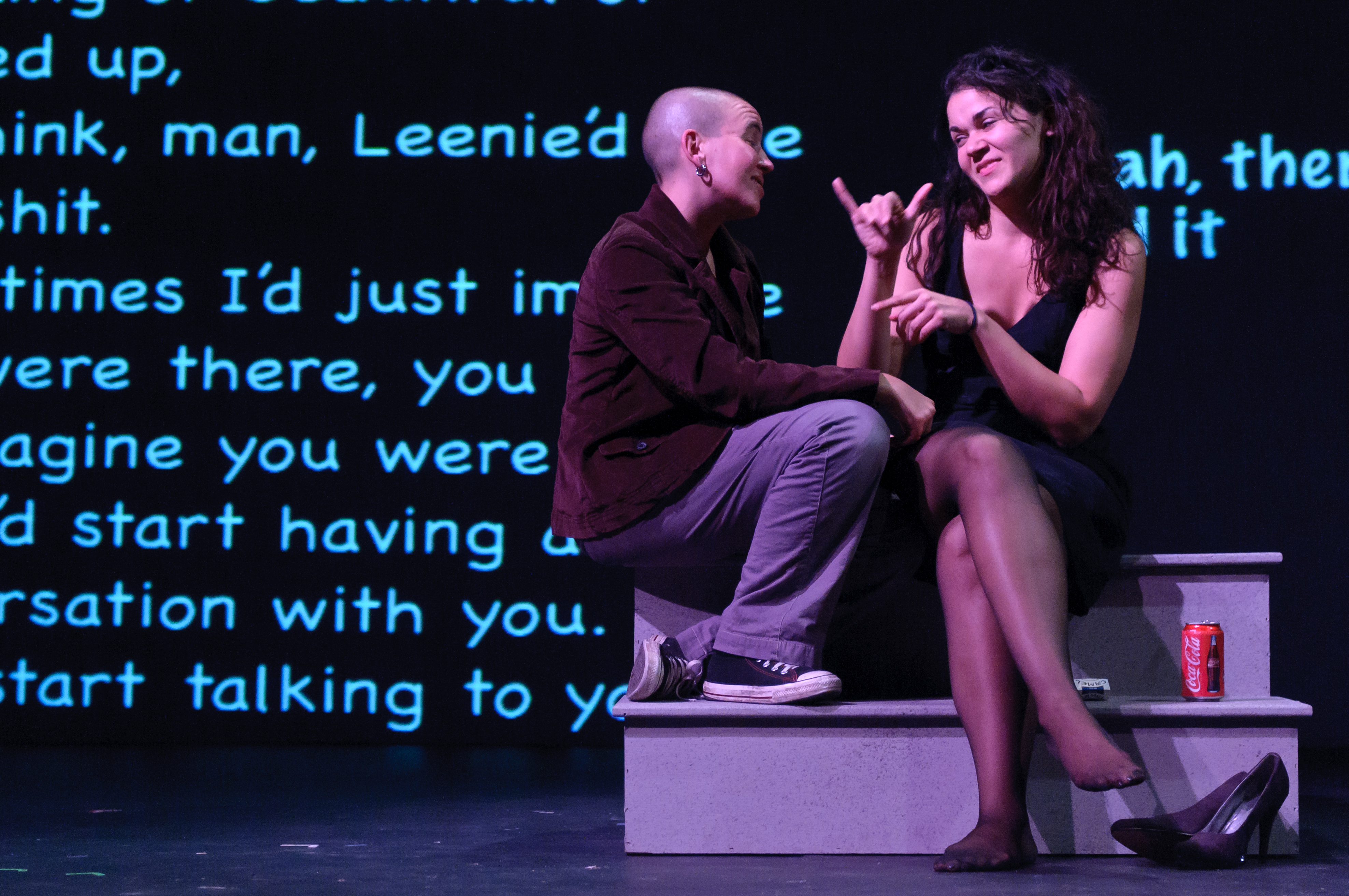 I should note that my measure of success in this case is not the accuracy of the translation (as a hearing person, who doesn’t understand ASL, I’m in no position to judge), but rather is the fact that Zapko and Wailes’ performances, and their use of ASL, are the most engaging aspects of the production. Both actresses portray an impressive range of expressions, depicting these characters over a wide range of ages. Furthermore, their descriptions of injury and pain so aptly communicate Dag and Kayleen’s tempestuous relationship, that it’s hard to imagine this play in a language other than ASL.