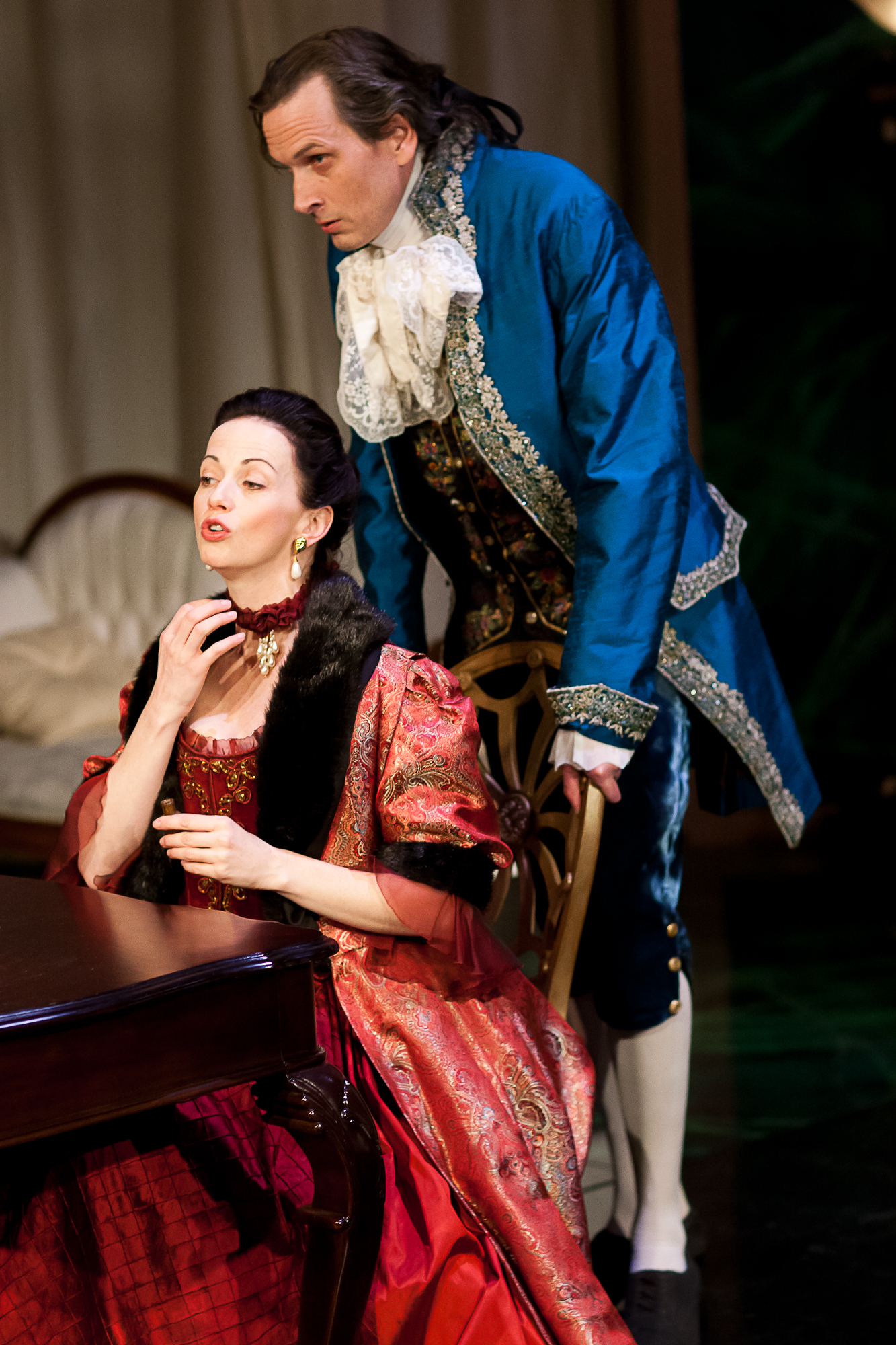 Looking for some deceit to spice up your week? Look no further than the Torch Theater’s production of Dangerous Liaisons. Based on the 1782 epistolary novel by Pierre Choderlos de Laclos, this delightfully devilish drama presents the scathing battle of wills and desires between La Marquise de Merteuil (Stacia Rice), a wealthy widow determined to manipulate social circles to her liking, and Le Vicomte de Valmont (John Middleton), at once her rival, co-conspirator, and lover. The Torch Theater does a lovely job of bringing the novel’s exchange of letters to the stage. (The production is based on Christopher Hampton’s 1985 adaptation for the Royal Shakespeare Company. Hampton also adapted the 1988 film starring John Malkovich and Glenn Close.) Unfortunately, this production’s loveliness works to undercut its potential to shock and move. The more salacious elements of Merteuil and Valmont’s plots, and the devastating consequences they exact, could have been pushed much further by the Torch’s capable and creative team.
