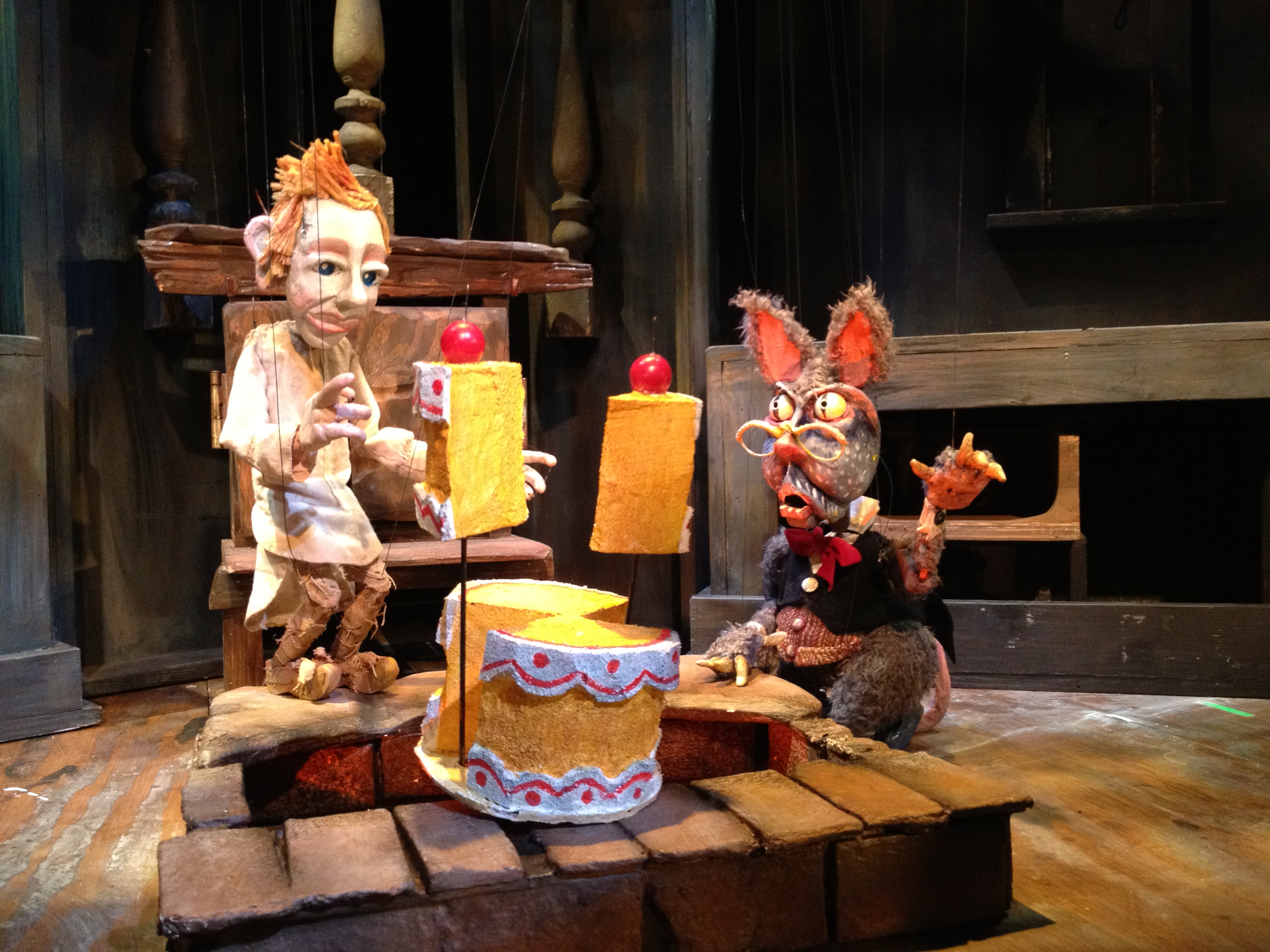 At the end of the show, the puppeteers put down their marionettes and came out on stage for a well-deserved bow. They looked huge, towering over the world that the marionettes had just inhabited. It’s not that puppeteers Laura Abend, Kyle Loven, Liz Schachterle, and Justin Spooner are particularly tall people. It’s that the show had trained me to see the marionettes’ size and proportions as a kind of norm. The fact that I experienced these artists as disproportionately tall, as literal giants, is a testament to the work’s success. The Sorcerer’s Apprentice establishes a world where rules of size and space work differently from our own. In so doing, the production does not just show the story of an aging sorcerer and his unwitting new apprentice, it teaches us how to see it.