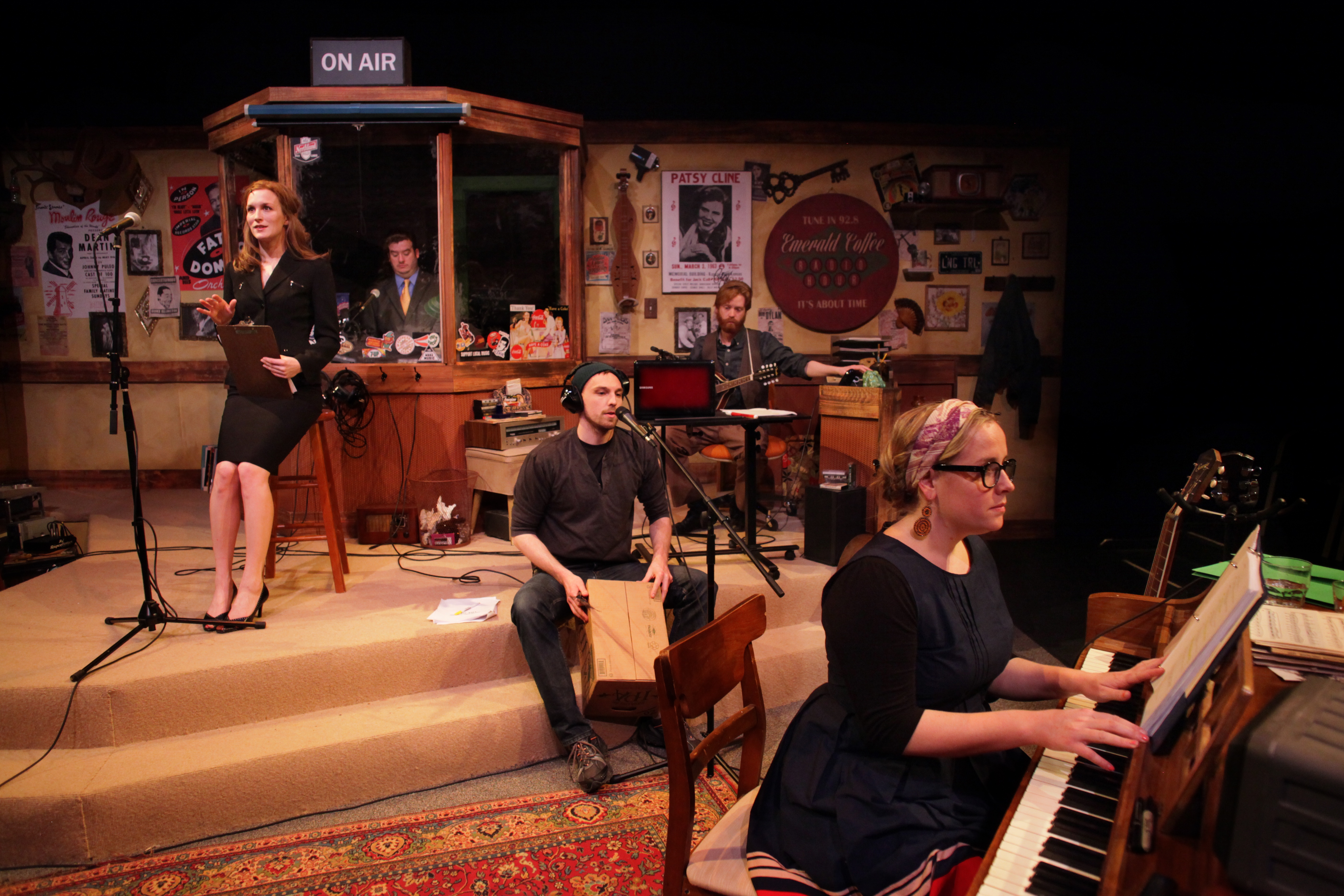 Developed by actors Mary Fox and Andy Frye with local musician Blake Thomas, Stay Tuned focuses on the transfer of power that occurs when a famous radio personality dies and leaves his nasty, profit-obsessed son Gordon in charge of the show. Gordon, played by Ryan Nelson, quickly hires producer Ashabell to modernize the production; an archetypal “city gal”, Ashabell doesn’t understand the charm of the vintage radio show with its live jingles and old school rehearsal process. (Yellow Tree theatergoers might recognize the Ashabell character as a kind of “prequel” to Rachel Petrie’s character in Miracle on Christmas Lake II.) In opposition to Gordon and Ashabell’s characters are the “three musketeers” of the radio show staff: Rusty (Blake Thomas), Scotty (Andy Frye), and the wonderfully charming Emma (Mary Fox). Despite this simplistic set up, the first act of the play promises some thought-provoking interactions, as all characters are stuck in their ways and someone’s going to have to give.
