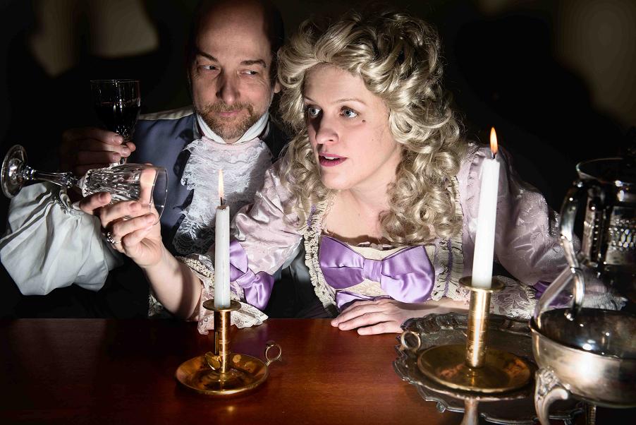 Directed by Carin Bratlie, the podium qua stage and the academically adorned blackboard play off of each other and underscore the kinship of living structures of complexity, be it in the form of physical laws or emotional vagaries. Brief but laden with sharp sarcasm or savvy retorts, each scene pulls us into an intimate exchange, brainy determination or conflict without letting it turn into narrative gossip. We do not know what Emilie’s nature was, but Shanan Custer infused her character with acuity, perspicacity, wit, and compassion with a balance that could only have delighted and gratified the illustrious historical Emilie. Matt Sciple (Voltaire) as the rest of the company altered their roles – and gender – and performed with the kind of indulgence that attests to the pleasure they took in portraying the life of this astounding woman.