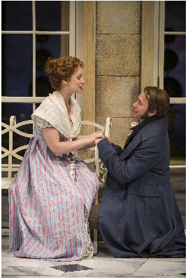 Ashley Rose Montondo (Elizabeth Bennet) and Vincent Kartheiser (Fitzwilliam Darcy) in the Guthrie Theater’s production of Pride and Prejudice, by Jane Austen, adapted by Simon Reade. Directed by Joe Dowling, set design by Alexander Dodge, costume design by Mathew J. LeFebvre and lighting design by Philip S. Rosenberg. Photo by Michael Brosilow.