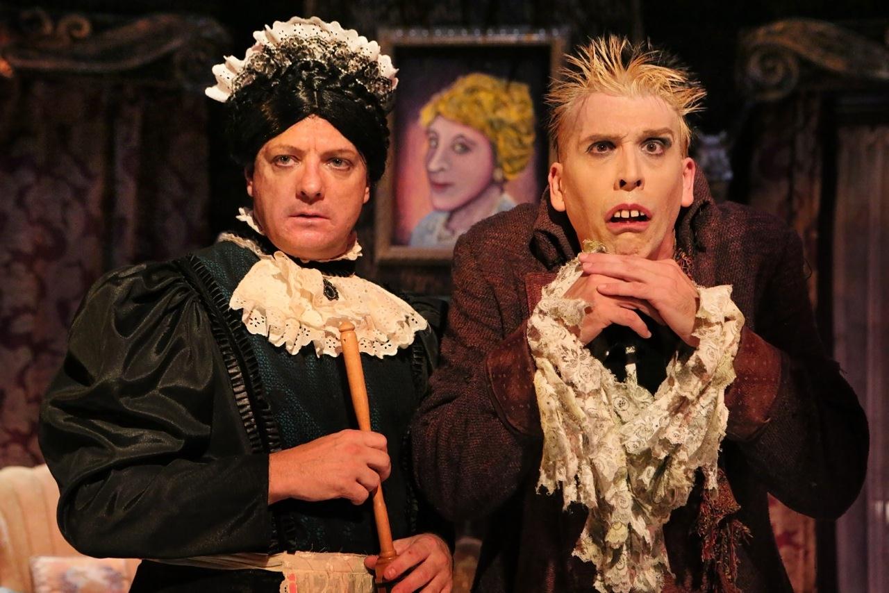 Ivey Award-winning actor Bradley Greenwald is excellent in this play and reprises his roles from the first production in 2010 (the play was revamped and brought back by audience demand, according to the press release). At six feet tall, Greenwald portrays the main female character, Lady Enid Hillcrest, with surprisingly mincing delicacy. The sight gags of him in pink ruffles, tiptoeing through the set, are worth the price of admission alone — not to mention the particularly affected, high-brow British pronunciation of certain words (“super-stis-ious” comes to mind). His portrayal of stable master/werewolf, Nicodemus Underwood, is also over-the-top wonderful and the interactions with co-star Stephen Cartmell as housekeeper Jane Twisden (and the beleaguered Lord Edgar Hillcrest) offer opportunities for plenty of naughty bits and double entendres.