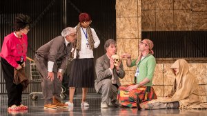 I love the inspiration and relevance of this world premiere and original production, which began when company members heard news stories about Syrian refugees. I also loved the brilliant and moving ensemble performances (Steven Epp, Jamal Abdunnasir, Kendra ‘Vie Boheme’ Dennard, Christina Baldwin, Maia Hernandez/Carolina Sierra, Orlando Pabotoy, Nathan Keepers, Rendah Heywood). I will admit to not being cool enough, however, to always appreciate theater that pushes the edge of conventional artistic experience. The chapter involving a dancer (a stunning Kendra ‘Vie Boheme’ Dennard) and a dying, polar bear was beautiful but bizarre. The production is three-hours long, including intermission, and my daughter and I thought at least two of the nine chapters were redundant. The most moving chapter to me involved Jewish emigres fleeing an oppressive USSR to a new life in Israel. Nathan Keepers as the husband gave a heart-wrenching performance as a composer describing the meaning and transformative nature of music. Keepers again as a trans librarian in the final chapters was delightful as comic relief. The set is a minimalist, industrial warehouse wonder–with innovative lighting and use of mixed media.