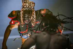 The father in the title is Webster Barnabas Chipaumire, a man that the creator/choreographer/director did not have contact or connection with from the age of five. He lived in Zimbabwe and died in 1980. She writes that she “put him in a boxing ring to battle with himself, his shadow, his ancestors, the industrial gods and that merciless tyrant: progress.” This battle includes a compelling blend of movement and dance, sometimes to Zimbabwean music or modern American hip hop. Chipaumire, Watt, and Kaolack move in and out of sync, converging periodically in the ring for tightly choreographed segments. The shifts in mood and style are frequent – athletic to tribal to hip hop to modern.