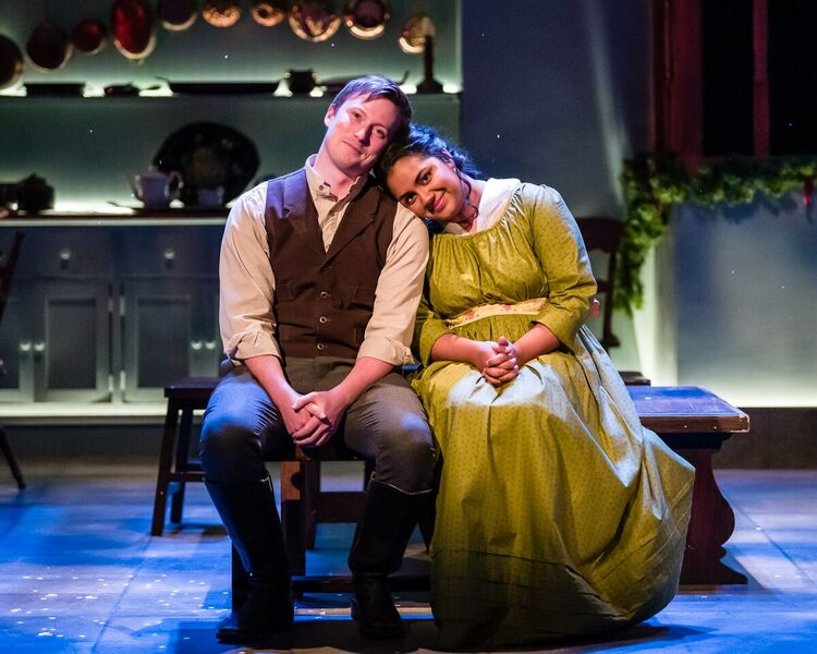 Roshni Desai (R) and Jesse LaVercombe (L) as Cassie and Brian in “The Wickhams: Christmas at Pemberley” Photo by Rich Ryan