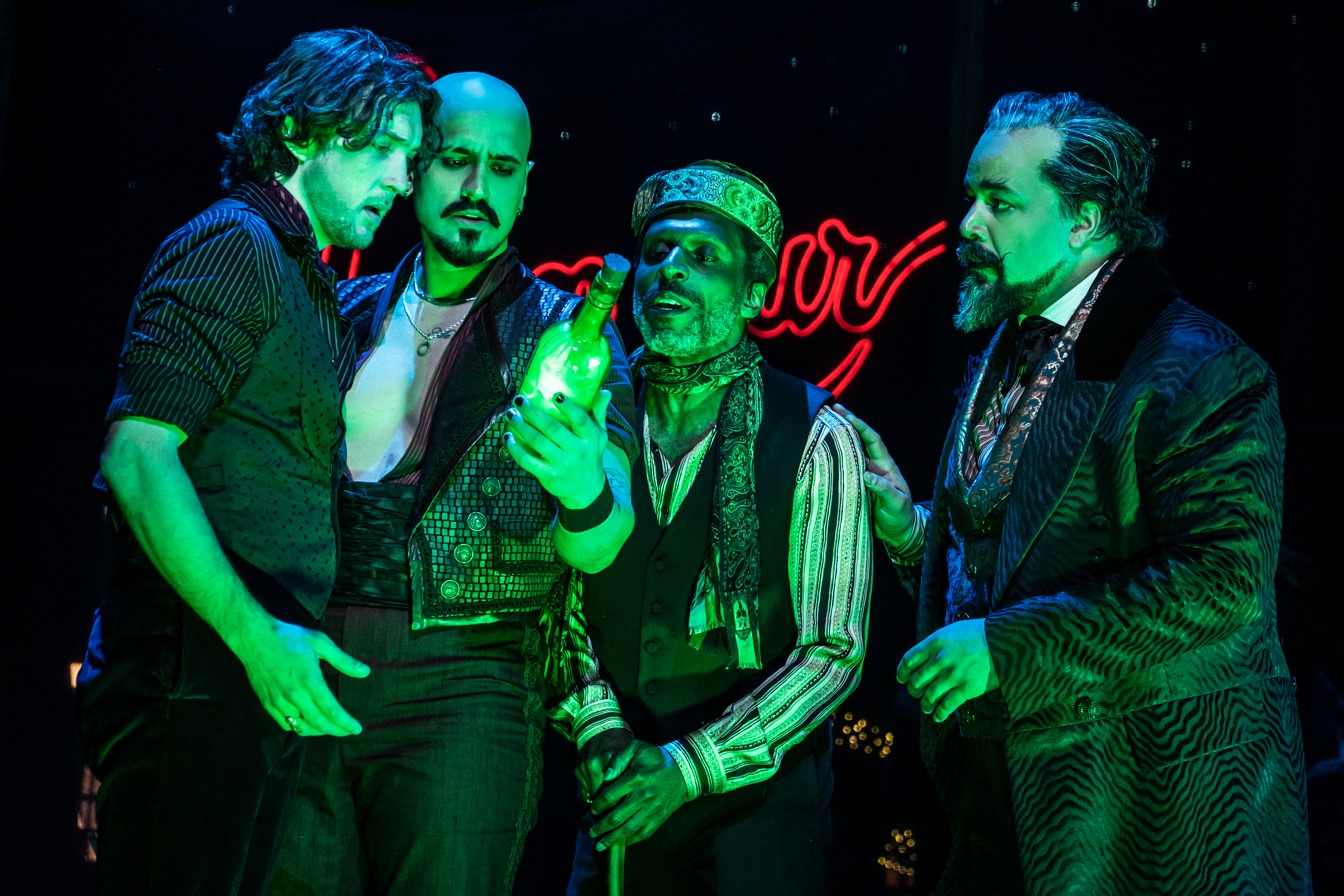 Despite an unusual technical hiccup that caused the show to abruptly halt near the beginning of the show, right before Satine’s appearance, I felt the cast and crew recovered well and only grew stronger throughout the show. On stage we found Harold Zidler (Austin Durant) to be a magnetic personality with a voice and presence to match. The role demands a larger-than-life actor and Durant proved to be more than up for the challenge. We thoroughly enjoyed his every moment on stage. Another pleasant standout was the character Toulouse played by André Ward. I felt he captured the true artist’s passion and the vivacity of the movement, not to mention Ward’s rich baritone notes, supreme presence, and control of his voice. Beautiful.