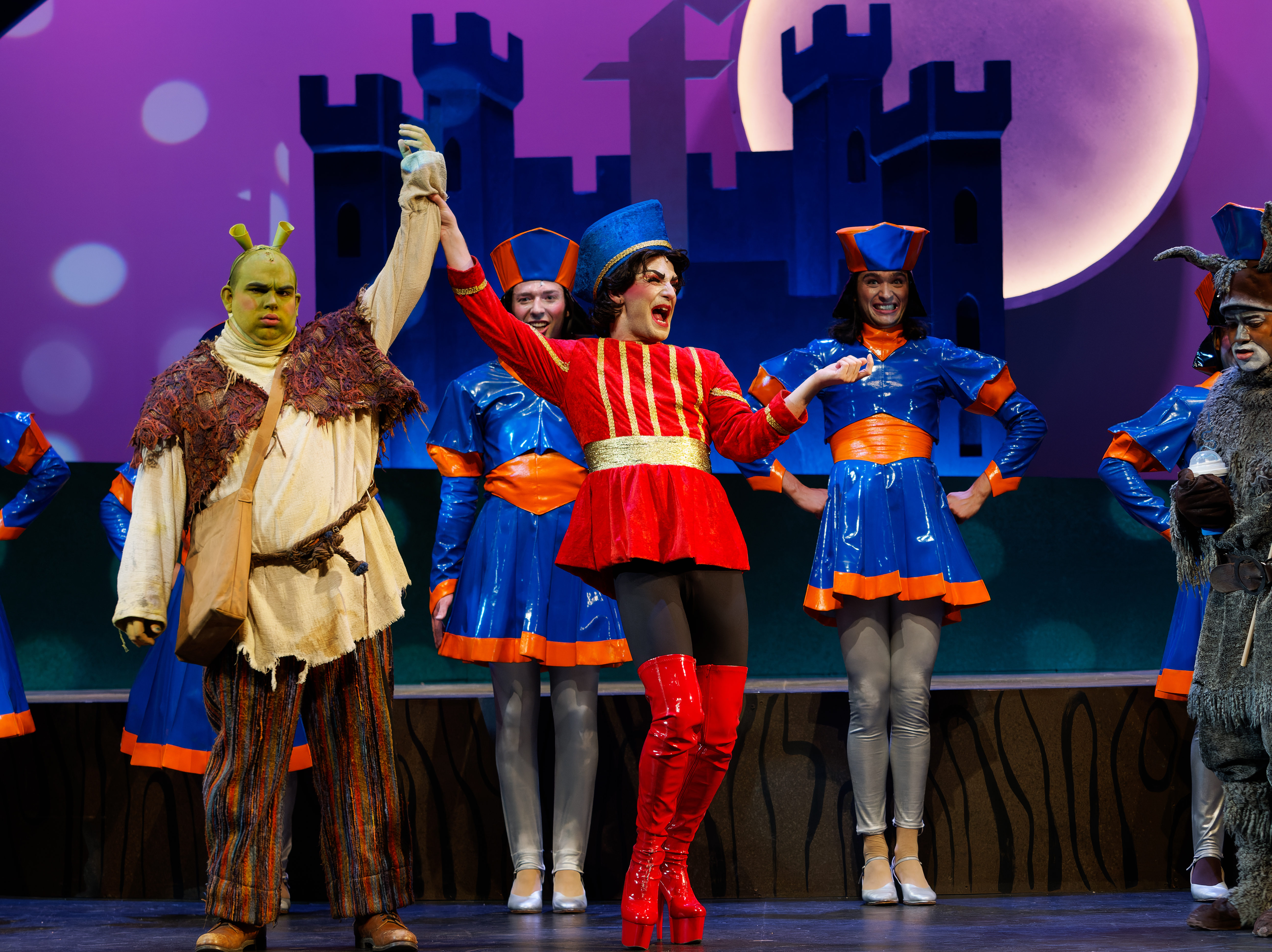 Artistry has decided to ignore all of these things and have Farquaad stand at his full height PLUS the addition of several inches of lift thanks to a pair of thigh-high “kinky boots.” The result is a Farquaad that towers over everyone else in the production, including the titular Ogre. To be clear, my only issue with this portrayal is the height of the character, everything else is played to absolute perfection by Jon Michael Stiff. They lean into the textual effeminate nature of the character with a delightful Drag Queen performance style which absolutely works wonders with highlighting the fabulous excesses of Lord Farquaad. What’s missing, however, is the hypocrisy that makes Farquaad ridiculous.