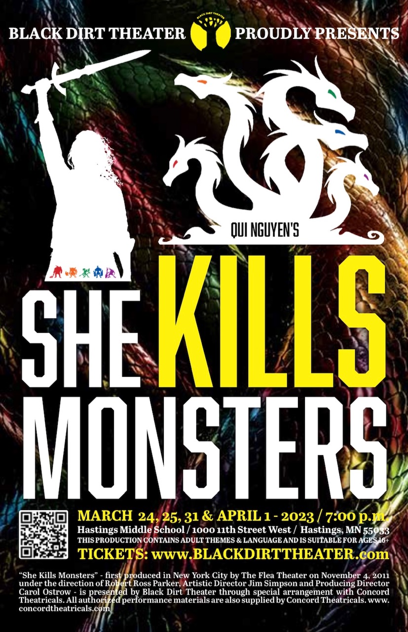 She Kills Monsters is presented by Black Dirt Theater at Hastings Middle School in Hastings, MN. Performances are March 24th, 25th, 31st, and April 1st at 7:00pm. Tickets can be purchased from http://www.BlackDirtTheater.com or at the door. This production contains adult language and themes and is suitable for ages 16+.