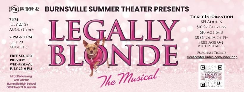 Has the premiere for Barbie got you hyped for campy fun, feminine power, or just looking at really pretty clothes? Do yourself a favor by donning some pink apparel and doubling the fun by making this production part of your double feature. Come support your local community theater with your attendance this weekend or next’s of Burnsville Summer Theater’s Legally Blonde: The Musical, directed by Erika Sasseville.