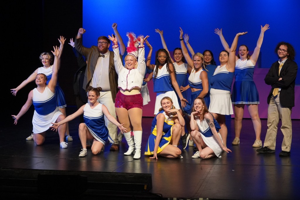 This production sports a large ensemble cast, and I was truly blown away by the talent displayed by each and every cast member. The comedic flair and timing was spot-on. There were many hilarious, stand out performances in this kooky cast of characters, like the hairdresser Paulette and her crush on UPS man Kyle, the pool boy Nikos and his (friend?) Carlos, and butt-busting exercise enthusiast Brook Wyndham. The girls of Delta Nu and the ensemble groups also majorly impressed with their over-the-top synced dance moves to marching band numbers, jump rope routines, Irish jigs, and the iconic “bend and snap”. Choreographer Zack Anderson made some truly delightful and whimsical routines.