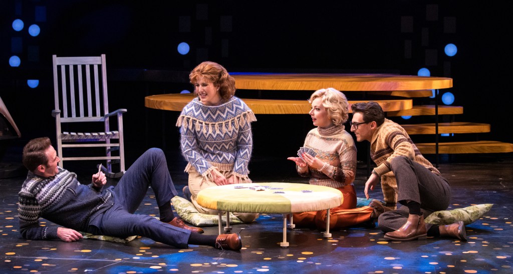 The script drives through the late 1950s-early 1970s and we are able to easily keep up with the changing times thanks to careful design choices by Scenic Designer (Nayna Ramey), Costume Designer (Barbara Portinga), and Lighting Designer (Sue Ellen Berger). The basic permanent scenic design hints at mid-century modern interior while allowing rolling furniture that makes up individual scenes to give more nuance to the time period and pairs exceptionally well with the geometric light installations against the back wall and a few delightful lighting surprises throughout the theatre and dining space. The costume design is everything you want in a period musical that features pop music groups of the 50s-60s, and you can tell that Portinga had an especially fun time costuming Shinah Hey as Cynthia Weil. Fashionable enough to be remarked upon at least once in the script, Weil is every bit the fashionista so it’s hard to pick a favorite look from the show, but my personal favorite (please forgive me, fashion is not my area so I’m sure this is not the correct terminology) was a certain patterned and flowing jumpsuit that she wears towards the end of Act II.