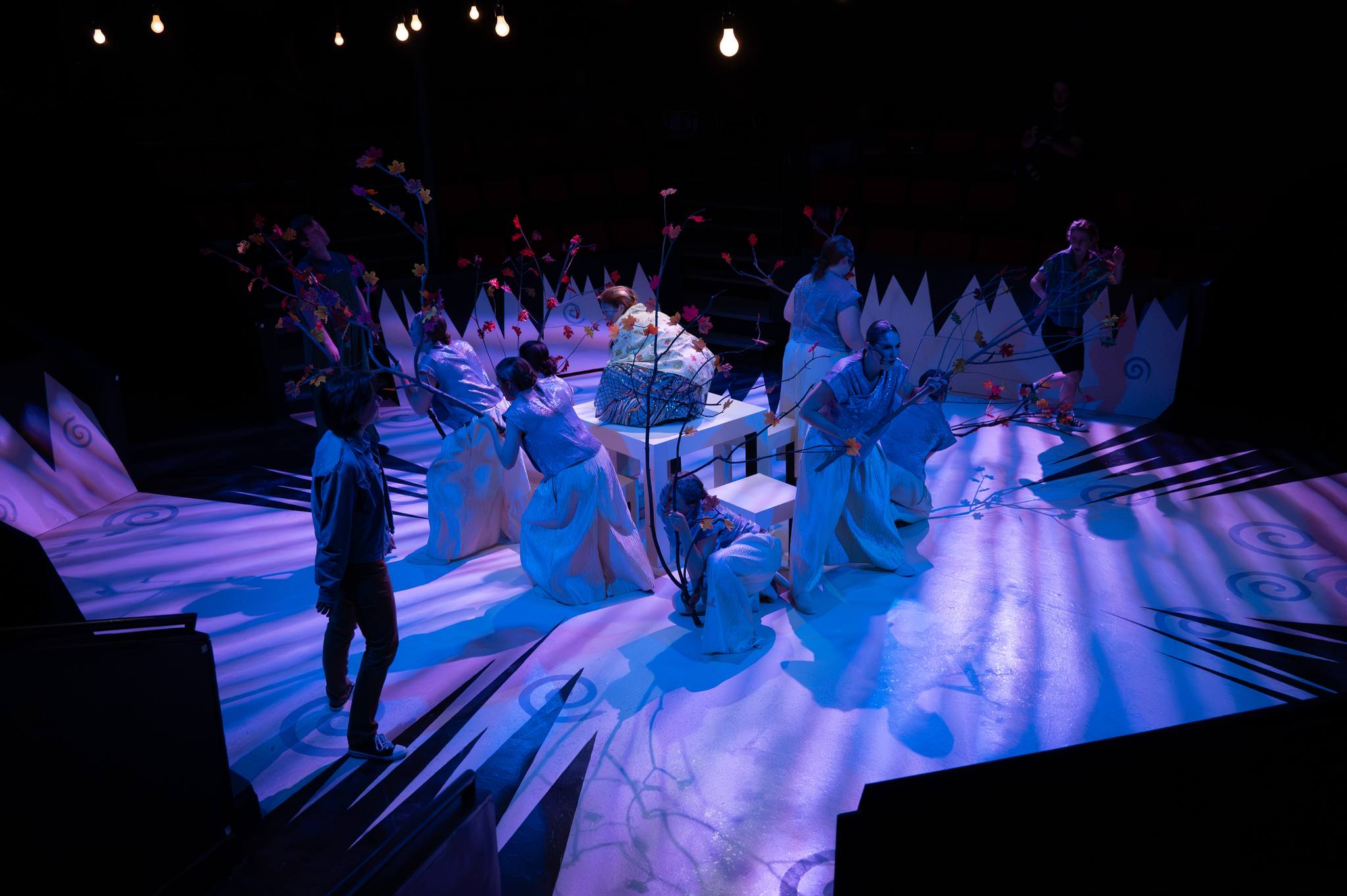Meg, Charles Wallace and Calvin travel from planet to planet, encountering mysterious beings and facing challenges during their journey to rescue their father. Parsons-Lord stated in her director’s notes that she “set the goal of creating everything you see on stage live with no recordings or projections.” Instead, she and the artistic/production staff created imaginative and clever props and set designs that conveyed the exotic places and alien creatures conjured originally through our imaginations. The lighting effects were also cleverly designed to capture time travel and the dystopian feel of planet Camazotz. The ensemble cast members (Kate Bonnett, Lizzie Esposito, Natosha Guldan, Isabelle Hopewell, Ariel Pinkerton, Erika Sasseville, and Kjer Whiting), dressed in glittery, space-agey costumes, moved on and off the stage to create various places and creatures to the delight of the audience.